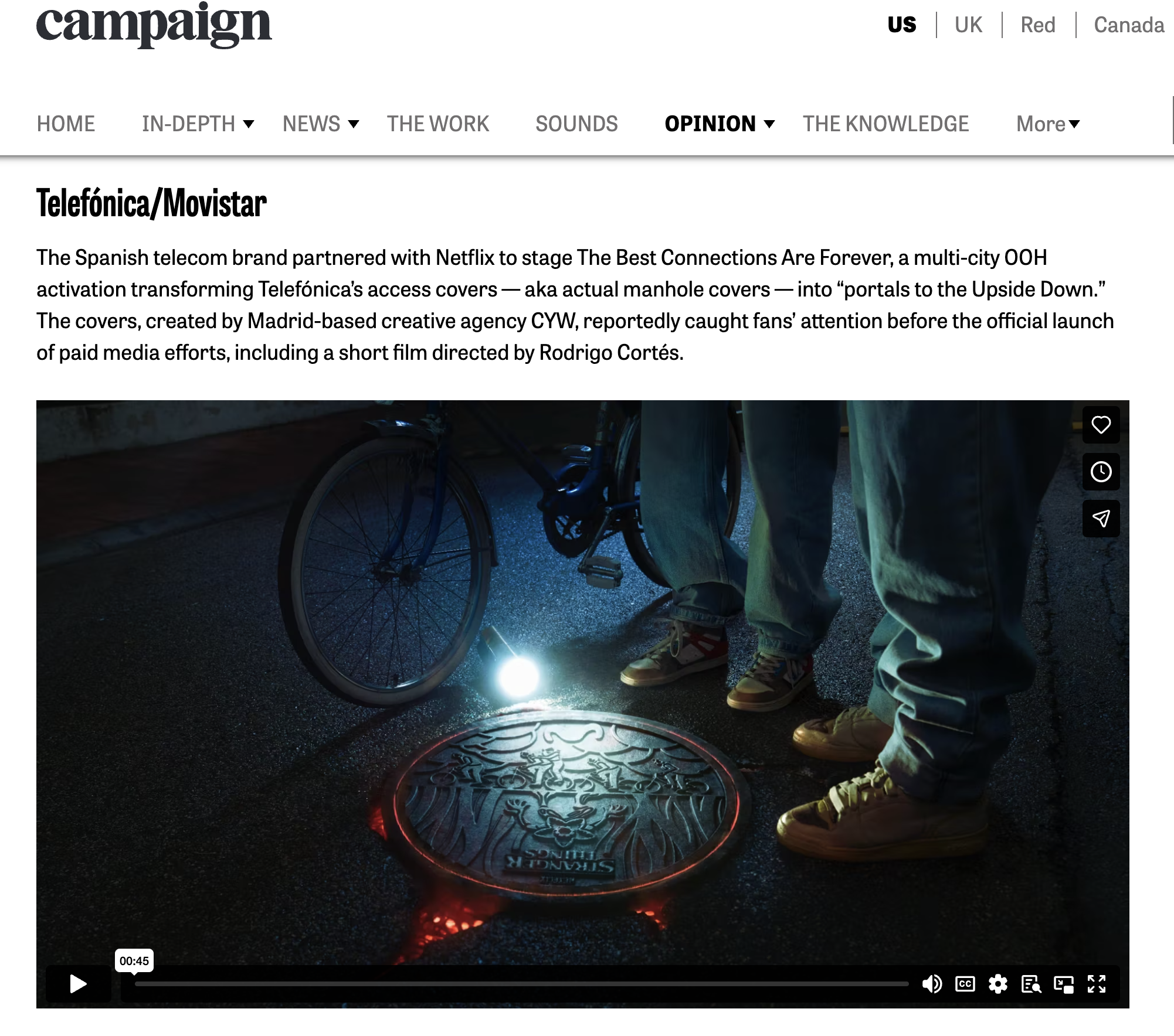 The Spanish telecom brand partnered with Netflix to stage The Best Connections Are Forever, a multi-city OOH activation transforming Telefónica’s access covers — aka actual manhole covers — into “portals to the Upside Down.” The covers, created by Madrid-based creative agency CYW, reportedly caught fans’ attention before the official launch of paid media efforts, including a short film directed by Rodrigo Cortés.