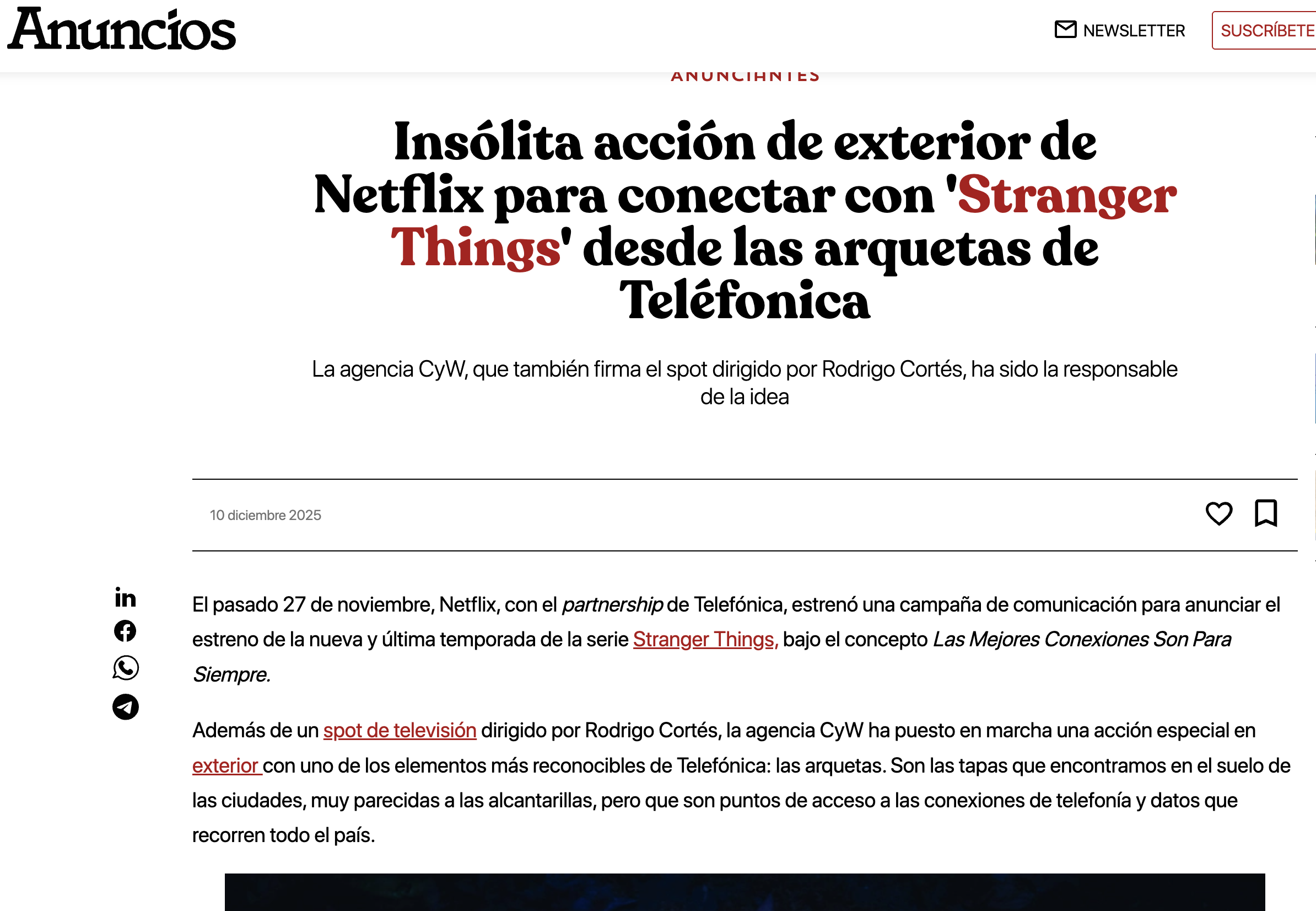 El pasado 27 de noviembre, Netflix, con el partnership de Telefónica, estrenó una campaña de comunicación para anunciar el estreno de la nueva y última temporada de la serie Stranger Things, bajo el concepto Las Mejores Conexiones Son Para Siempre. Además de un spot de televisión dirigido por Rodrigo Cortés, la agencia CyW ha puesto en marcha una acción especial en exterior con uno de los elementos más reconocibles de Telefónica: las arquetas. Son las tapas que encontramos en el suelo de las ciudades, muy parecidas a las alcantarillas, pero que son puntos de acceso a las conexiones de telefonía y datos que recorren todo el país.