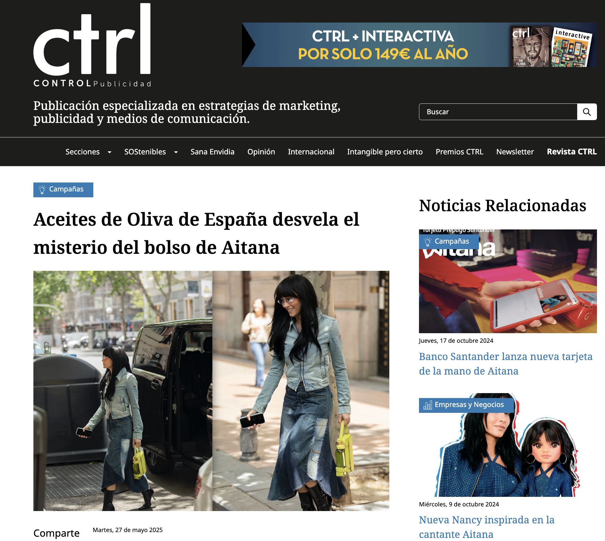 Hace unos días la cantante Aitana se paseó por las calles del centro de Madrid luciendo un llamativo bolso con una botella de aceite de oliva integrada, un complemento que causó mucho revuelo y cuyo sentido es desvelado en la nueva campaña creada por la agencia CYW para Aceites de Oliva de España.